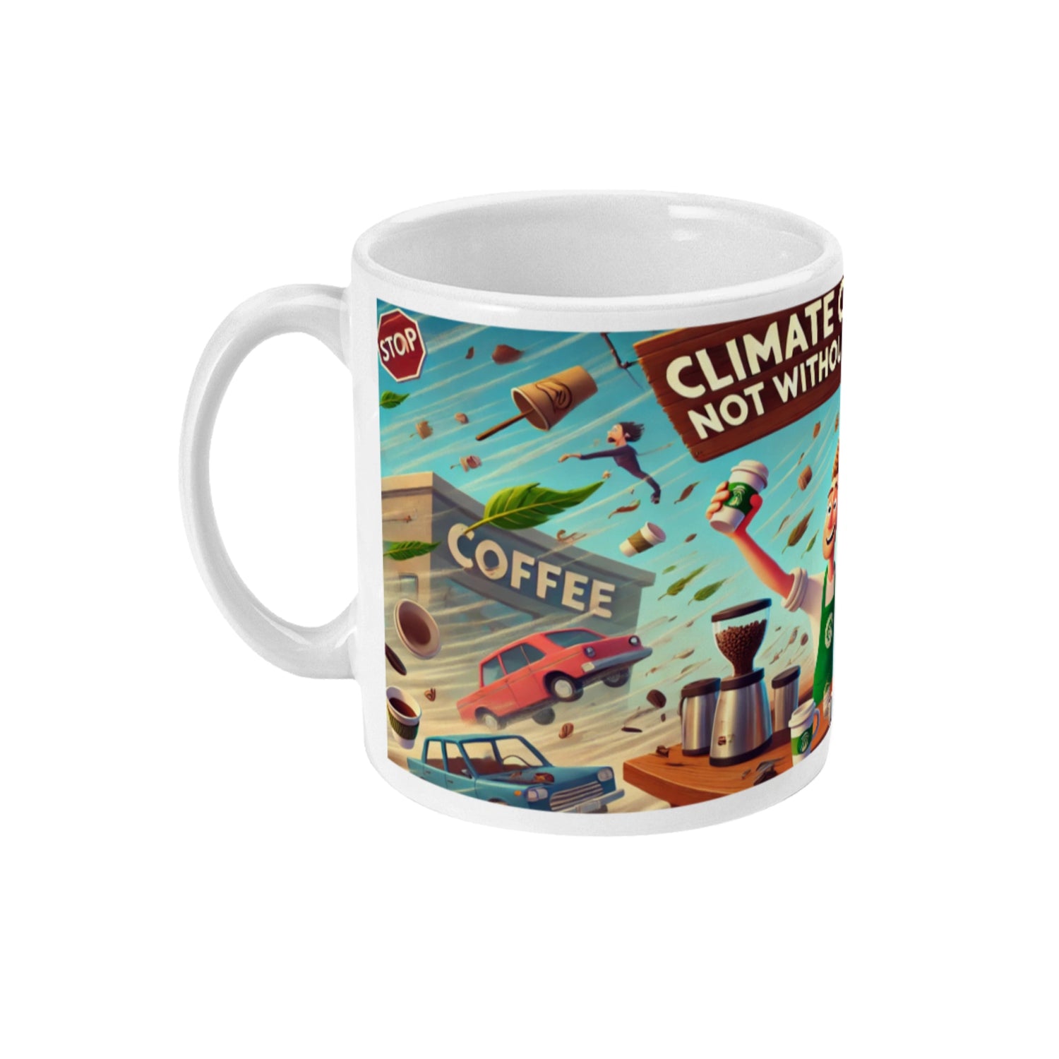 Met de grappige tekst 'Climate Change? Not Without Coffee!" steekt deze mok met koffie afbeelding de draak met de klimaatdoelen en de gevaren van klimaatveradering, terwijl het benadrukt dat koffie altijd een prioriteit blijft.. Perfect voor wie houdt van een vleugje humor bij hun dagelijkse dosis cafeïne.